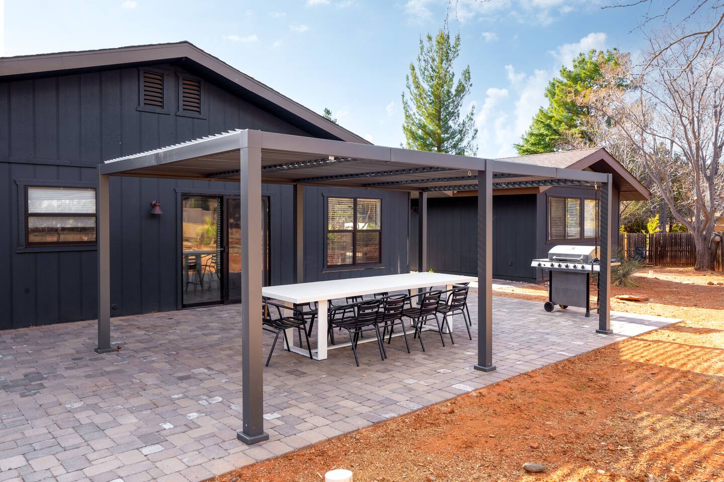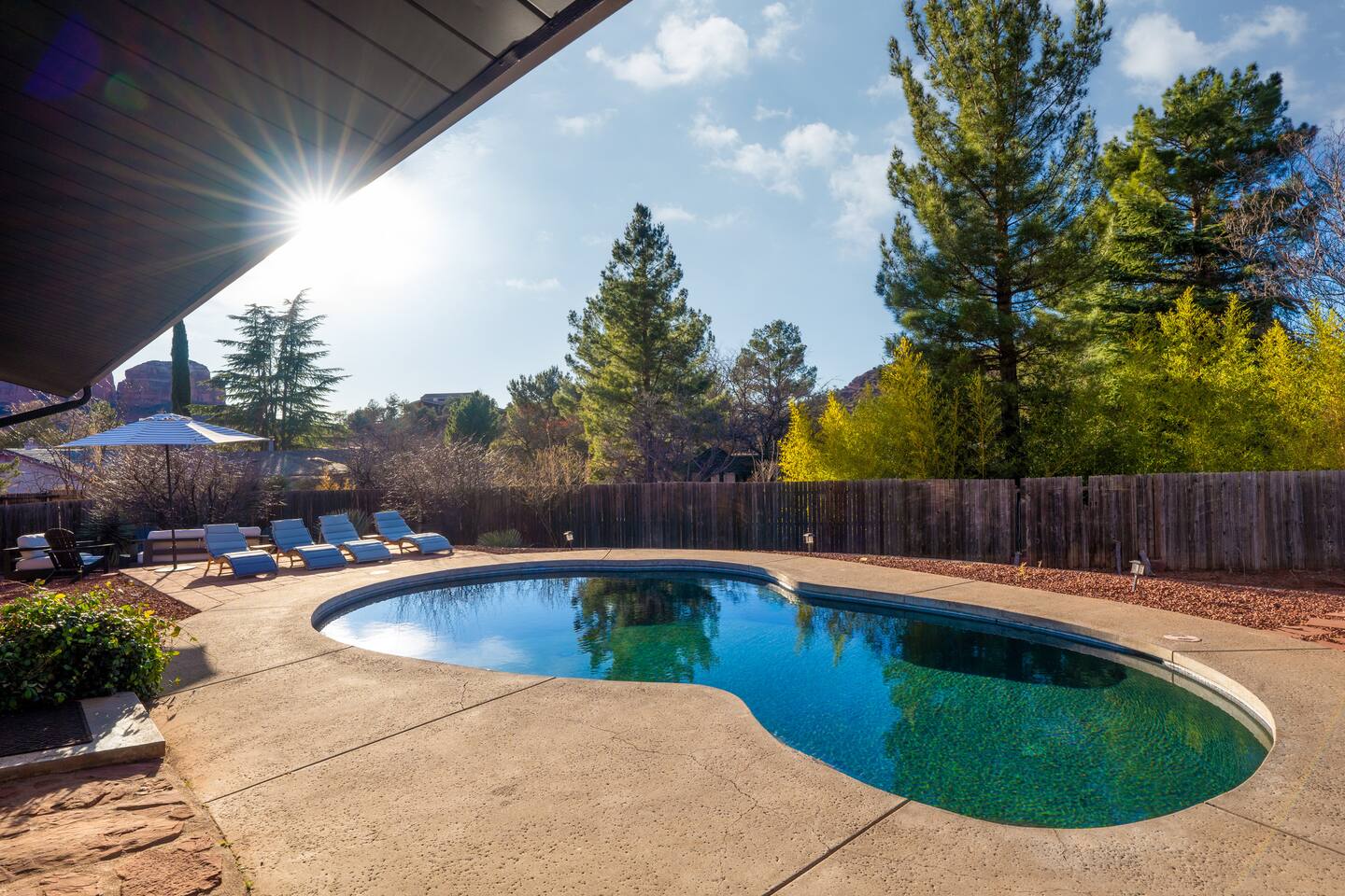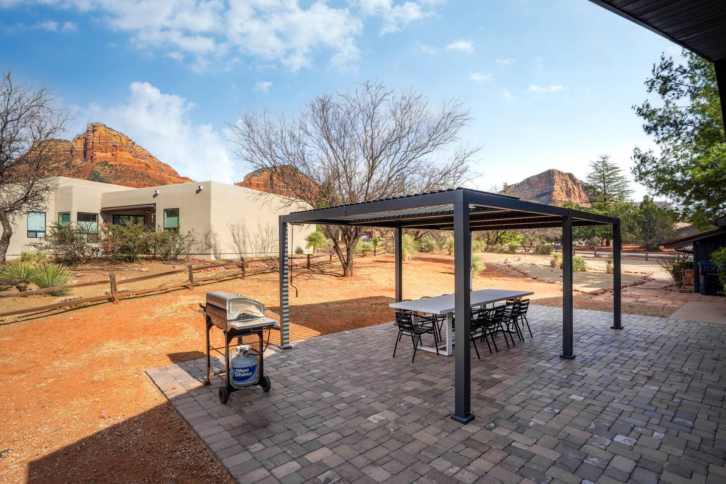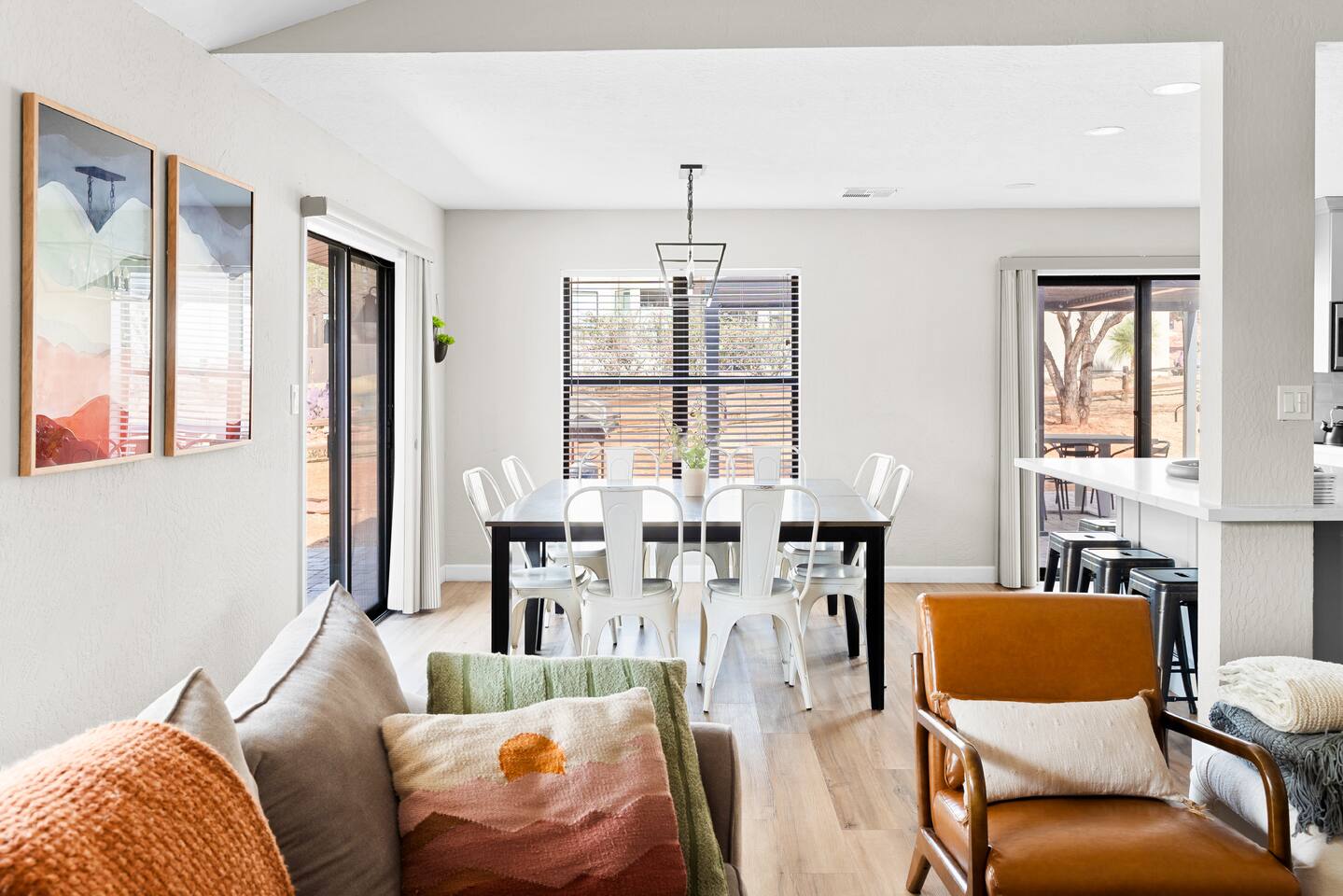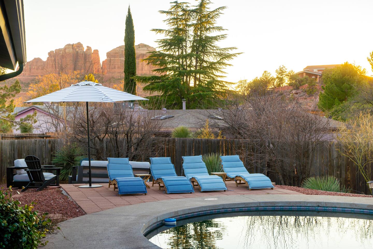 Nestled amidst the breathtaking red rock landscapes, our recently renovated Sedona home is designed for those seeking a refined yet relaxed getaway. Thoughtfully curated with stylish details and modern comforts, this is more than just a place to stay—it’s a space to gather, unwind, and create unforgettable memories. Step into the living room, a sprawling, open-concept space where comfort meets sophistication. The 65-inch HD Smart TV mounted from the ceiling is perfect for movie nights, while the ample seating invites you to sink in and relax. Kids will delight in discovering a hidden trove of board games beneath the kitchen island, including the ever-popular SedonaOpoly. Whether you’re stretching out on an Alo yoga mat or pouring a glass of wine from the island’s built-in wine fridge, every detail here is designed for indulgence. The dining area is a place for connection, where a spacious table comfortably seats ten for family-style meals. Additional seating can be found at the oversized kitchen island with its four bar stools, as well as at the outdoor dining table, ensuring there’s room for everyone to gather. The kitchen is a dream for home cooks and entertainers alike, fully stocked with high-quality cookware, cooking essentials, and both indoor and outdoor wine glasses. From a blender for morning smoothies to multiple coffee makers for your perfect morning brew, we’ve thought of everything. Cook well, eat well, live well. Outside, the pool area offers a private oasis framed by stunning views. A fenced, in-ground pool is surrounded by four brand-new lounge chairs, three reclining chairs, and six floats for sun-soaked relaxation. Next to the pool, four Adirondack chairs circle a brand-new Williams Sonoma fire pit, where you can toast marshmallows under the stars. An outdoor sofa and lounge chair complete this tranquil setting, making it the perfect spot for slow mornings and golden-hour cocktails. The home boasts five thoughtfully designed bedrooms. The primary suite features a plush king bed, a walk-in closet, and a private bathroom, with direct access to the pool through a child-safe door. Cathedral Rock sunrise views pour in each morning, creating a magical start to your day. Two additional king bedrooms, each with mounted Smart TVs and ceiling fans, provide peaceful spaces for rest, while the fourth bedroom is a bunk room built for fun, complete with two full-over-full bunk beds. For those seeking added privacy, the Casita offers a secluded sanctuary. This detached suite features a king bed, breathtaking mountain views, and a Smart TV. A dedicated workspace makes it ideal for remote work, while a kitchenette with a fridge, microwave, and French press ensures ultimate convenience. The Casita also includes its own full bathroom with a walk-in shower, giving guests a hotel-like experience within the comfort of a home. With four full bathrooms, the home is designed to accommodate large groups effortlessly. And for families traveling with little ones, we’ve provided two pack-and-plays and a few high chairs. The home is fully accessible, with no steps required to enter, making it comfortable for guests of all ages. To make your stay even more memorable, we’ve just added a brand-new firepit, outdoor seating area, and pergola—the perfect place to gather under Sedona’s legendary night sky. Whether you’re here to explore, recharge, or simply savor the beauty of the desert, our home is designed to make your stay seamless, luxurious, and unforgettable. Book your Sedona escape today—you’ll be glad you did. Arizona TPT: 21528909