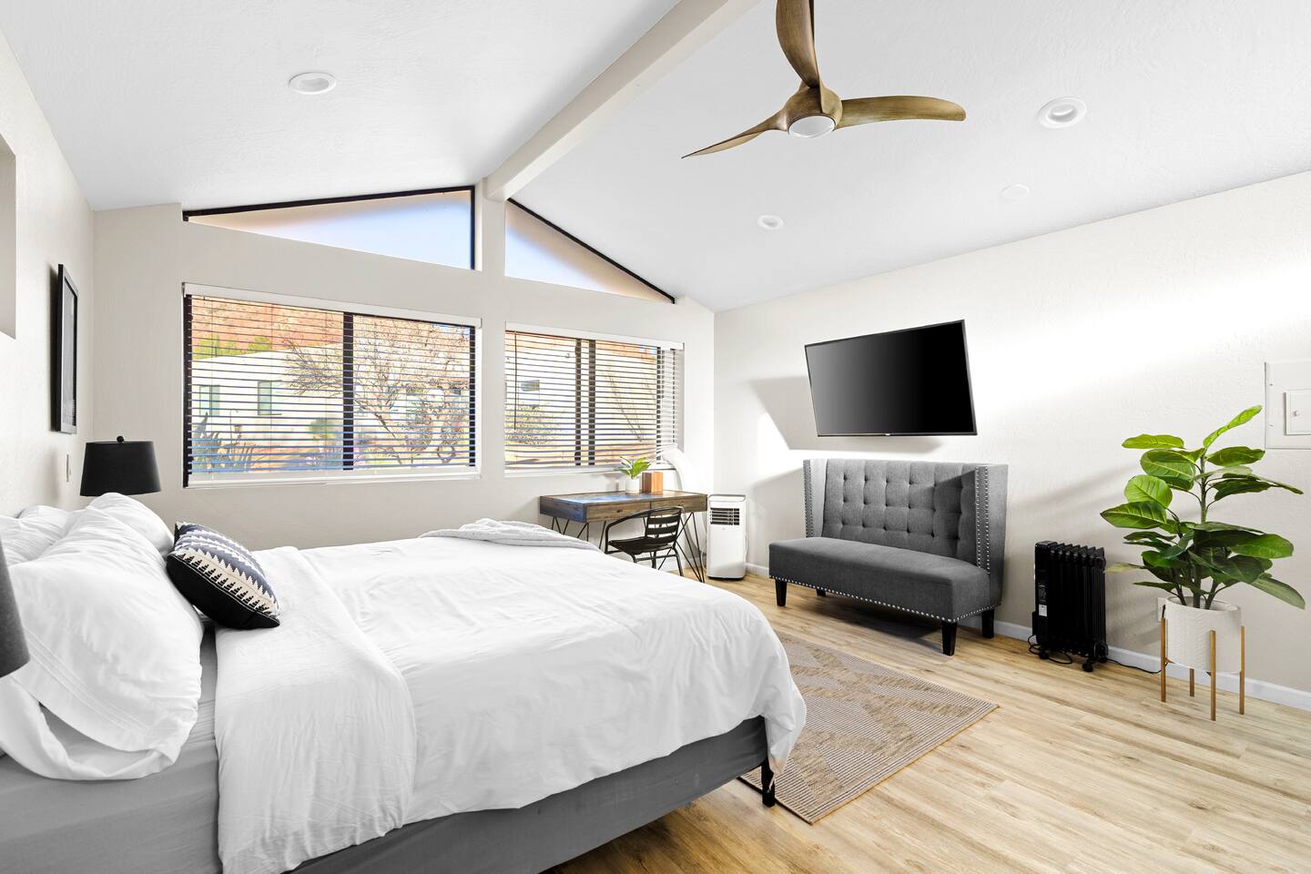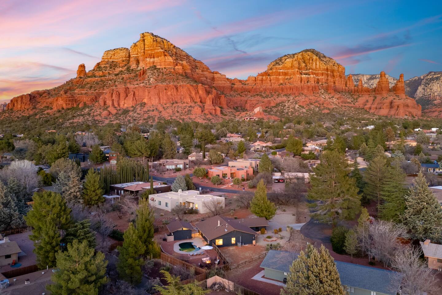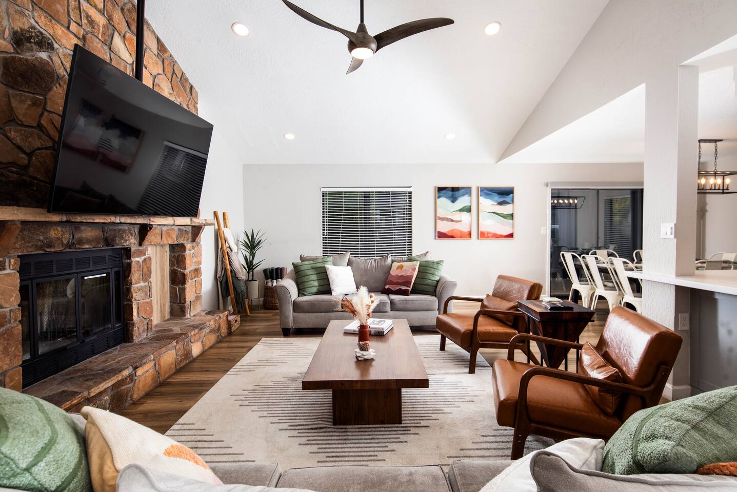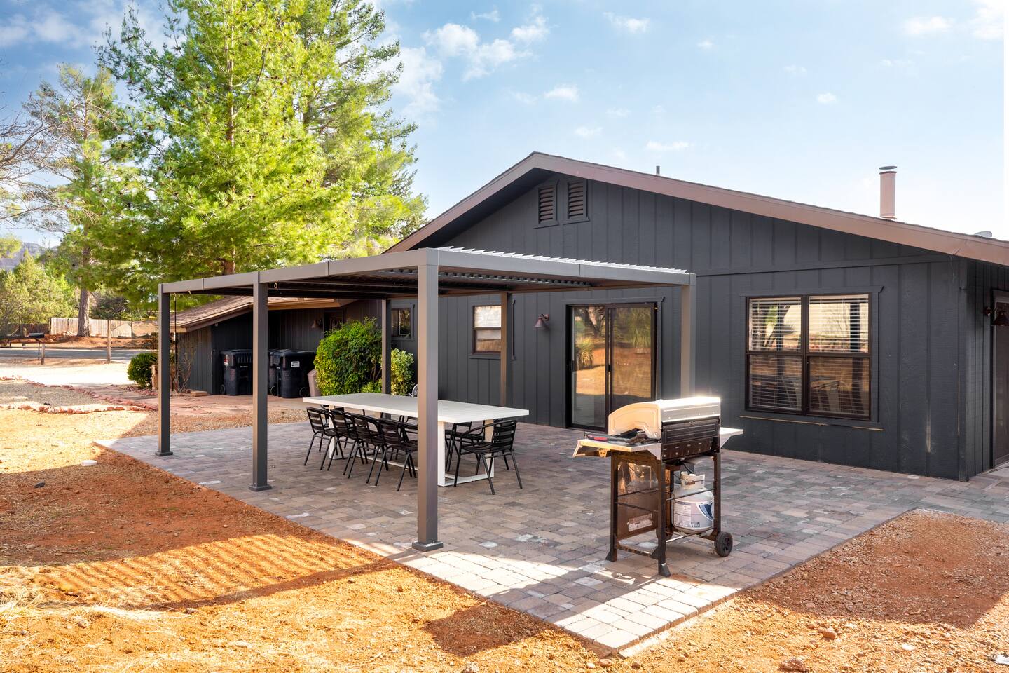 Nestled amidst the breathtaking red rock landscapes, our recently renovated Sedona home is designed for those seeking a refined yet relaxed getaway. Thoughtfully curated with stylish details and modern comforts, this is more than just a place to stay—it’s a space to gather, unwind, and create unforgettable memories. Step into the living room, a sprawling, open-concept space where comfort meets sophistication. The 65-inch HD Smart TV mounted from the ceiling is perfect for movie nights, while the ample seating invites you to sink in and relax. Kids will delight in discovering a hidden trove of board games beneath the kitchen island, including the ever-popular SedonaOpoly. Whether you’re stretching out on an Alo yoga mat or pouring a glass of wine from the island’s built-in wine fridge, every detail here is designed for indulgence. The dining area is a place for connection, where a spacious table comfortably seats ten for family-style meals. Additional seating can be found at the oversized kitchen island with its four bar stools, as well as at the outdoor dining table, ensuring there’s room for everyone to gather. The kitchen is a dream for home cooks and entertainers alike, fully stocked with high-quality cookware, cooking essentials, and both indoor and outdoor wine glasses. From a blender for morning smoothies to multiple coffee makers for your perfect morning brew, we’ve thought of everything. Cook well, eat well, live well. Outside, the pool area offers a private oasis framed by stunning views. A fenced, in-ground pool is surrounded by four brand-new lounge chairs, three reclining chairs, and six floats for sun-soaked relaxation. Next to the pool, four Adirondack chairs circle a brand-new Williams Sonoma fire pit, where you can toast marshmallows under the stars. An outdoor sofa and lounge chair complete this tranquil setting, making it the perfect spot for slow mornings and golden-hour cocktails. The home boasts five thoughtfully designed bedrooms. The primary suite features a plush king bed, a walk-in closet, and a private bathroom, with direct access to the pool through a child-safe door. Cathedral Rock sunrise views pour in each morning, creating a magical start to your day. Two additional king bedrooms, each with mounted Smart TVs and ceiling fans, provide peaceful spaces for rest, while the fourth bedroom is a bunk room built for fun, complete with two full-over-full bunk beds. For those seeking added privacy, the Casita offers a secluded sanctuary. This detached suite features a king bed, breathtaking mountain views, and a Smart TV. A dedicated workspace makes it ideal for remote work, while a kitchenette with a fridge, microwave, and French press ensures ultimate convenience. The Casita also includes its own full bathroom with a walk-in shower, giving guests a hotel-like experience within the comfort of a home. With four full bathrooms, the home is designed to accommodate large groups effortlessly. And for families traveling with little ones, we’ve provided two pack-and-plays and a few high chairs. The home is fully accessible, with no steps required to enter, making it comfortable for guests of all ages. To make your stay even more memorable, we’ve just added a brand-new firepit, outdoor seating area, and pergola—the perfect place to gather under Sedona’s legendary night sky. Whether you’re here to explore, recharge, or simply savor the beauty of the desert, our home is designed to make your stay seamless, luxurious, and unforgettable. Book your Sedona escape today—you’ll be glad you did. Arizona TPT: 21528909